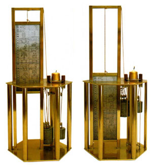Reloj de la plata vivaEl quinto modelo está considerado, en cierta manera, un precursor de los relojes mecánicos que un siglo después iban a levantarse en las torres de los ayuntamientos y las catedrales de las grandes ciudades europeas. Se llamaba reloj de la plata viva, nombre que recibía por entonces el mercurio, y, además de marcar las horas, servía de astrolabio.