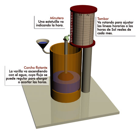 ....Plus:El mecanismo de los relojes de vela y agua se inspira en un modelo que inventaron los griegos varios antes. En la Grecia clásica se adoptaron muchos de los avances que se habían conseguido en Mesopotamia y Egipto para medir el tiempo, pero –como en tantas otras ramas del saber y el arte– los griegos procesaron los descubrimientos foráneos para darles una nueva forma más desarrollada y sofisticada. Además de los relojes de Sol, recurrieron a las clepsidras para medir el paso del tiempo. Así, por ejemplo, famoso es el uso de una clepsidra en los tribunales atenienses para regular el tiempo del que disponía cada orador para pronunciar su alegato. Pero fueron los ingenieros de la escuela de Alejandría, y en particular Ctesibio, quienes diseñaron los relojes de agua más ingeniosos.
