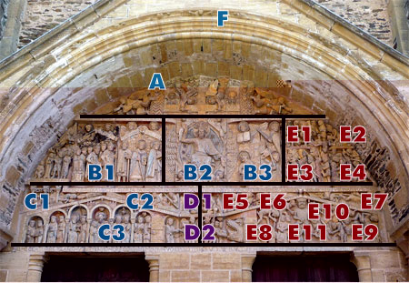 El segundo nivel representa la separación de los justos y los condenados cada uno a un lado de Cristo, que ocupa la posición central. Es una imagen muy habitual y proviene de la descripción del Juicio Final de Mateo: