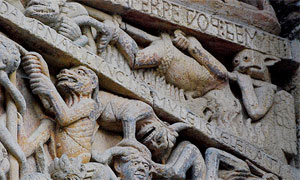 Arosnide, que se encuentra en el extremo, medio en cuclillas. Su historia está relacionada con uno de los negocios más rentables del Medioevo, el tráfico de reliquias.