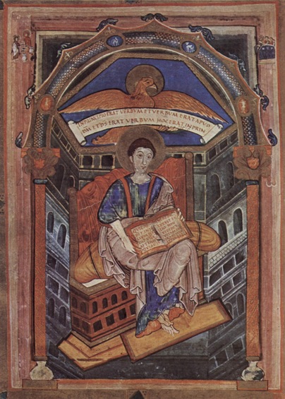 En esta imagen de los Evangelios de Saint Medard de Soissons (de principios del siglo IX, se representa a San Juan , sentado en un trono de Jerusalem. Esta vez si tiene un libro , y es aprovechado para insertar la siguiente frase latina: