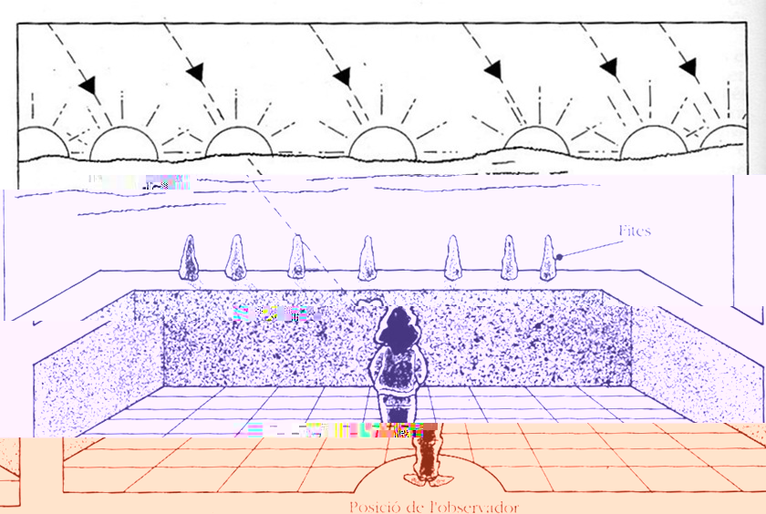 Wasintonia nos trasladaba entonces conceptos genéricos aplicables a cuanto se dice hoy en este interesante debate. De hecho la fotografía insertada del santuario celtíbero de Segeda, muestra las características edificativas de poniente, cuando lo normal en el románico, es referido al orto solar por aquello del Ego sun lux mundi... Entonces, el standsill lunar, es la menor parada y no la mayor como indica la imagen, puesto que ésta haría que nuestro satélite se pusiera 5,14º aún más al norte de la línea del solsticio, coincidiendo posiblemente con el collado que se ve más allá del mismo, en la dirección que en la fotografía se denomina 'norte astronómico'.