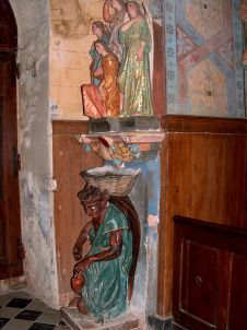 Ya sé que no tiene mucho que ver... o si más no por la cronologia... no obstante, a modo de curiosidad, os adjunto la imagen del a pila bautismal de la iglesia de Rennes-le-Chateau, Francia, donde la pila está sujeta por el demonio Asmodeo...