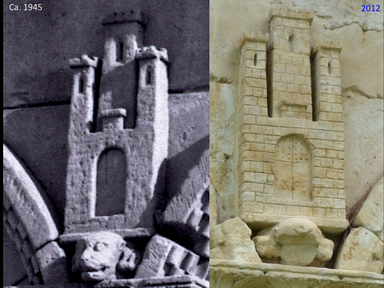 Imágenes del castillo que decora una de las alas del claustro de Mas del Vent: a la izquierda la imagen en Ciudad Lineal , a la derecha en Palamós. Nótese que la superficie ha sido trabajada con una incisión más profunda para definir más los sillares del castillo , lo que ha dado lugar a una reducción del tamaño de las ventanas lo que prueba que el castillo viene de una época anterior al montaje en Ciudad Lineal (Madrid) en 1934 ¿ que hace una cabeza de león de bajo del castillo en la foto de 1945?