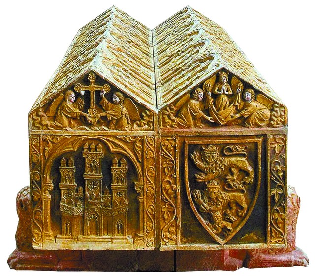 en los años 1197 y 98, según acreditan sus inscripciones : hiciéronse a mano, sobre un tejido gris muy compacto, a punto de media, y bordadas luego en oro y seda carmesí, con castillos heráldicos y Cruz de Jerusalén, también denominada Cruz de las Cruzadas, es una cruz heráldica y un símbolo del cristianismo. En recuerdo a su hermano Ricardo Corazón de León
