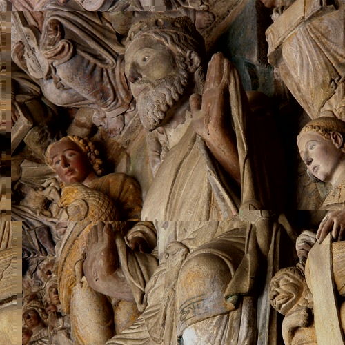 En segundo lugar y volviendo al tema que nos ocupa, el de San Mateo, si analizamos el tratamiento iconográfico de los rostros de los cuatro Vivientes, vemos que el de Mateo recibió un tratamiento iconográfico diferente. De entrada, tres de los cuatro rostros parecen pertenecer claramente a jóvenes imberbes, con lo que la descontextualización de su edad parece querer indicar que en el tímpano no se refleja la historia (lo visible, siguiendo con el juego de palabras de Fiore que proponías el otro día) sino la fe (lo invisible o inteligible).