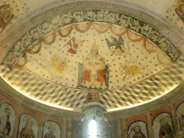 Poco queda definido, pero en Bagüés se intuye la existencia de ese Tetramorfos rodeando el Pantocrátor en el bóveda absidial de cuarto de esfera: