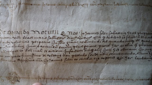 Intento terminar los estudios sobre mi pequeño pueblo e intento seguir lo máximo que puedo los temas preciosos del foro, en este ínterin, me he dado cuenta que habéis dejado pasar una perla, que, en el referente a la geometría, es toda una sorpresa. Añado una increíble comparación entre una pintura y una firma en un pergamino que he estudiado en su momento, pergamino perteneciente a Casserres, vecino de Puig-reig. La pintura es de la abadía de San Galgano, que intuyo recibirá la visita de Xavi muy pronto. Si os fijáis, en la parte inferior izquierda del pergamino encontraremos dibujada la misma forma geométrica que hay en la pared de Galgano, un laberinto que por supuesto, encontraremos en otros sitios. Es solamente un detalle curioso.