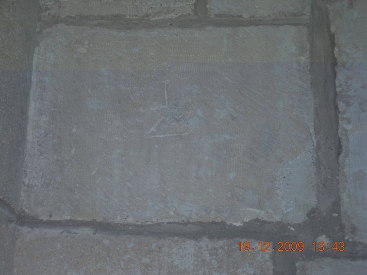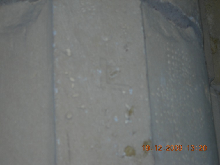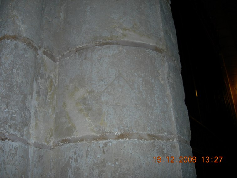 Esta marca, de la que ni sé su datación, si es de cantero o significa alguna otra cosa, fue nominada en este foro por alguien -que ya no recuerdo tampoco- como un 'lignum crucis', una marca que determinaría que tal vez existiese alguna reliquia así en el templo en cuestión.