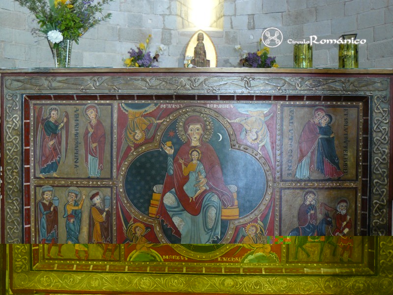 Aprovecho la magnifica composición de las fotos para comentar un detalle relativo a la mano de la Virgen Eloísa, que parece realizar un acto de bendición: en el frontal del altar de Santa Maria de Lluçà la Virgen ejecuta el mismo movimiento con la mano derecha, pero, segurando una poma!!!