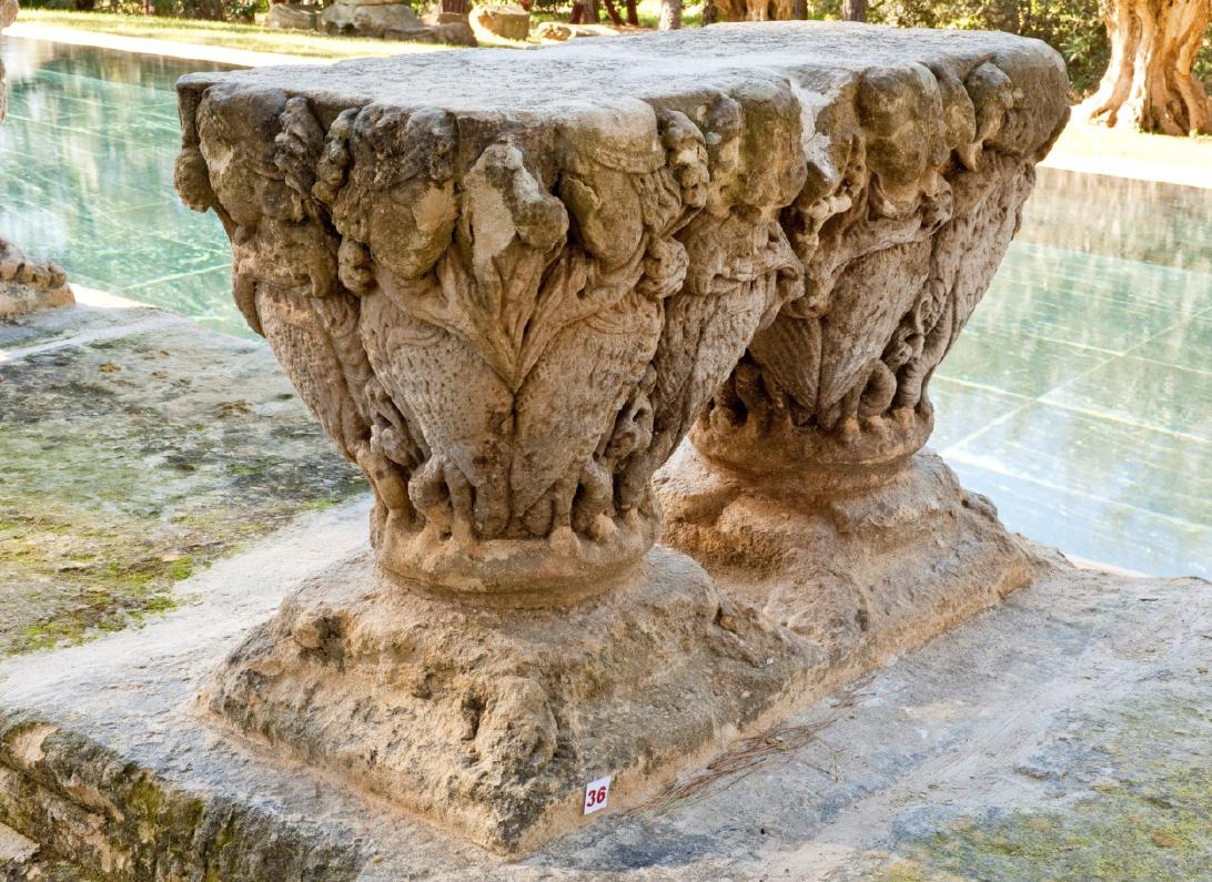 Se ha montado tan sólo el capitel y la basa solidaria con el zócalo. El capitel tiene una fractura longitudinal en el medio que lo divide en dos bloques.El grado de deterioro es muy avanzado, el conjunto se ve afectado por la humedad,tanto capilar desde el subsuelo como ambiental. Está situado junto a la piscina y próximo al césped.