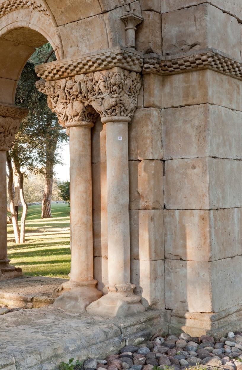 A la derecha puede distinguirse una ventana que es la misma que también observamos en la fotografía sobre la cabeza de Moreno. La reconstrucción de los ábsides fue total, Imagen pero tampoco debemos afirmar que todo lo que vemos allí es 'falso', como sucedió de manera similar -tras mil años de historia- en San Juan de la Peña o previsiblemente con los capiteles y cimacios del claustro palamosino, en el que los paramentos verticales son más que improbable, imposible -principalmente por su volumen, peso y estado de conservación-, que sean los originales después de un milenio de olvido en cajas, pues nadie lo recordaba antes construido.