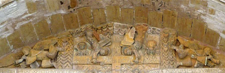 abad Oldoric, que levantó la primera iglesia. Este abad le da la mano a un personaje coronado, que lleva un cetro en la mano. Es