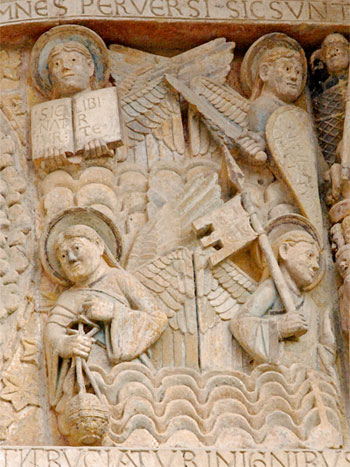 Pedro por las llaves del Cielo que lleva en la mano y, a su lado, a la