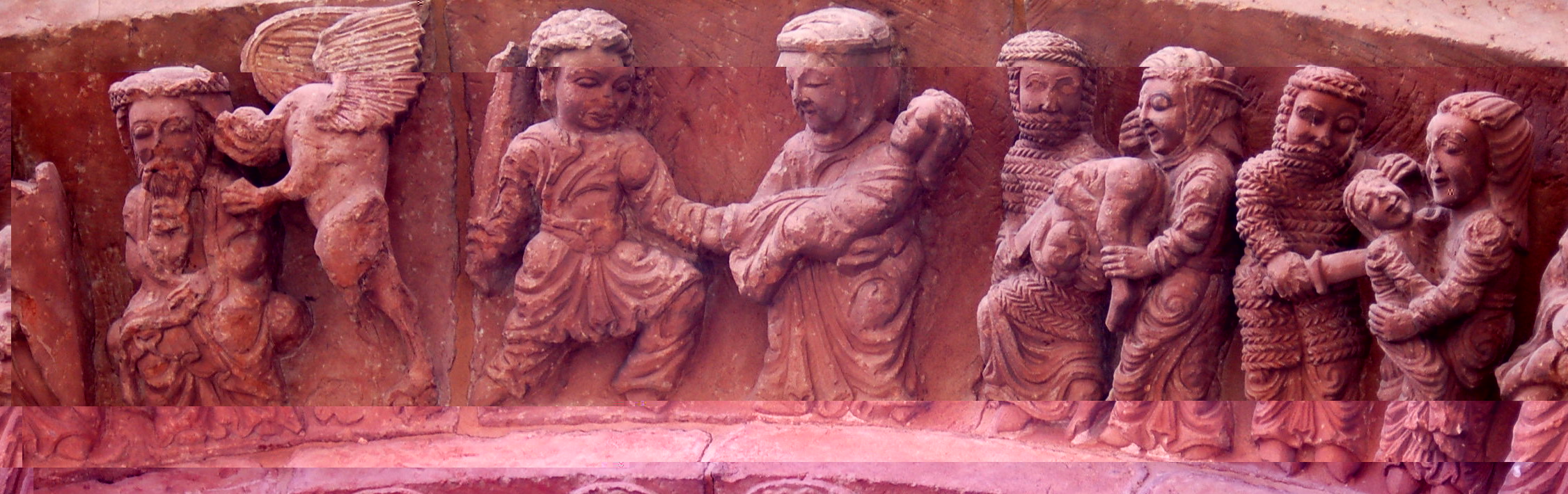 Voy a intentar seguir la propuesta de Eadan. La representacion de escenas referentes a la matanza de los inocentes es un tema bastante recurrido en el romanico. Supongo que vendria a ser una especie de apocalipsis a la inversa , es decir del pasado.