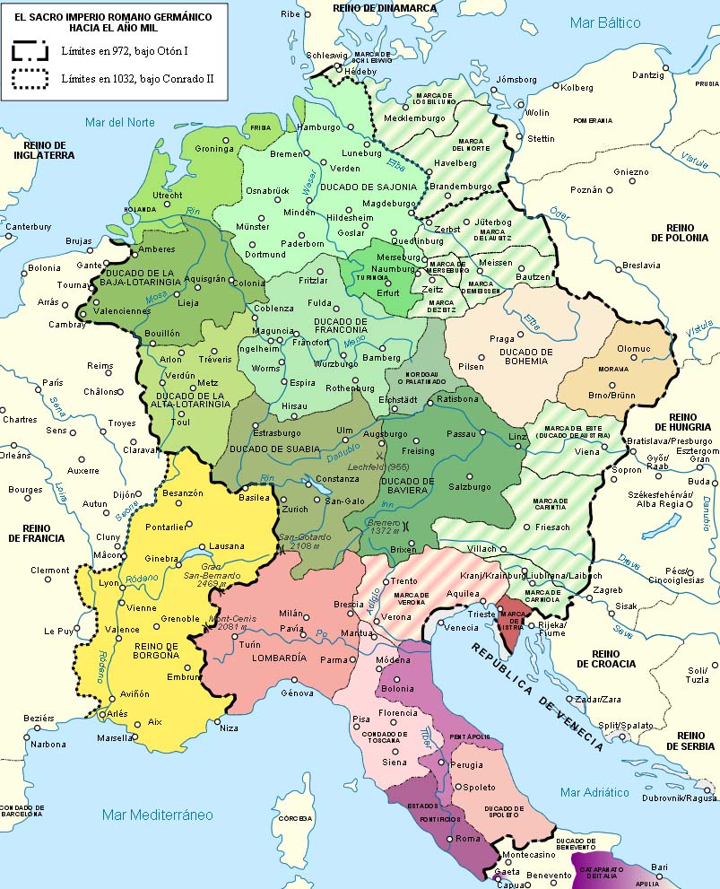 Según citan las fuentes, el románico en el Imperio Germánico no aparecerá hasta el reinado de Enrique IV (1056-1106), tercer emperador de la dinastía salia; aunque no será hasta el primer emperador Hohenstaufen, Conrado III (1138-52), cuando se afiance. Se caracteriza por tener edificios de gran tamaño, excesivamente altas, con cubierta plana de madera; siguiendo lo que otonianos y salios habían edificado anteriormente. Su planta se caracteriza por la bipolaridad; asemejando dos iglesias adosadas, puesto que tiene dos cruceros, dos presbiterios, y dos ábsides: poligonales o semicirculares; flanqueados por torres; lo normal es que uno de estos coros se levante sobre una cripta. Con el avance del románico, la nave central se cubrirá con bóveda de arista, correspondiendo un tramo de ésta con dos de las laterales. Apean en columnas que articulan los muros, además de las formas de resalte y los contrastes de luces y sombras en los muros. María Laach es el claro ejemplo de estas características, como veremos posteriormente. Con esta disposición, el interior se divide en tramos independientes y no en las naves corridas que todos conocemos. Además de la influencia otónida, Cluny y el románico borgoñón, influirán a la hora de construir, sobretodo los monasterios benedictinos. Pongo un par de mapas: Adjunto: Adjunto:
