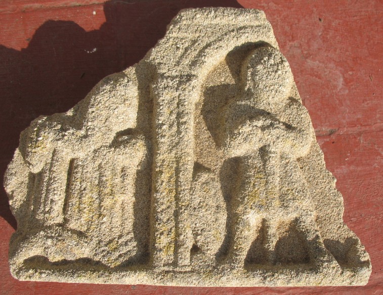 Este trozo de frontal se ha encontrado en Rota (Cádiz), en una escombrera ilegal, perdonad que la foto que os enviara estuviera sin limpiar, como podéis apreciar se realizo en la misma zona que se encontró, en estos momentos se esta siguiendo una linea de trabajo para identificar el lugar exacto de donde procede, probablemente el casco urbanos de la ciudad, coincido con el último comentario, lo que tiene el personaje al lado izquierdo es un escudo, y probablemente es las manos una espada, las dimensiones de la pieza son 25 cms de alto por 30 cms de ancho (línea inferior), por último os envió dos fotografías de la pieza ya limpia, y desde otro ángulo, gracias por la información facilitada.