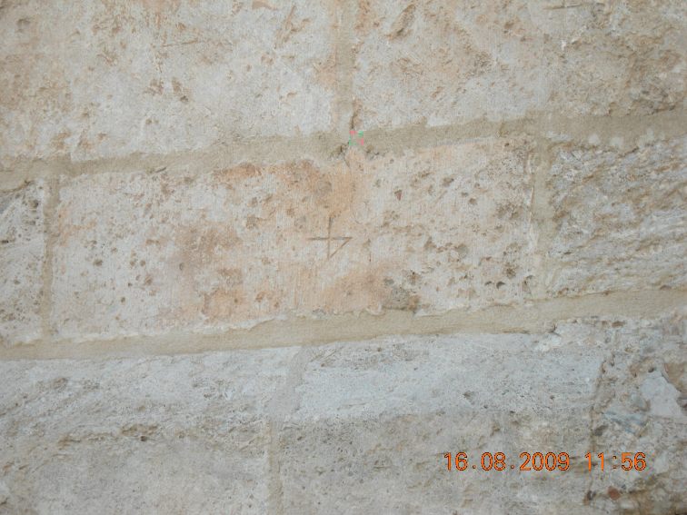 Mando una foto, que no es marca, más bien grafiti, ya que la estrella de cinco puntas, pentáculo, se encuentra en todos los puntos geografícos peninsulares, arquitectura tanto civil como religiosa, y hasta en una mazmorra del siglo XVII, auqnue como reseño anteriormente se trate de grafiti, inserto en las paredes de dicha mazmorra por los reos, donde se observa también un listado con unas líneas verticales que "penden" bajo una horizontal, que era el control del tiempo que llevaban o el que les restaba de condena. También se ve, una espada corta o cuchillo largo. Curiosa.