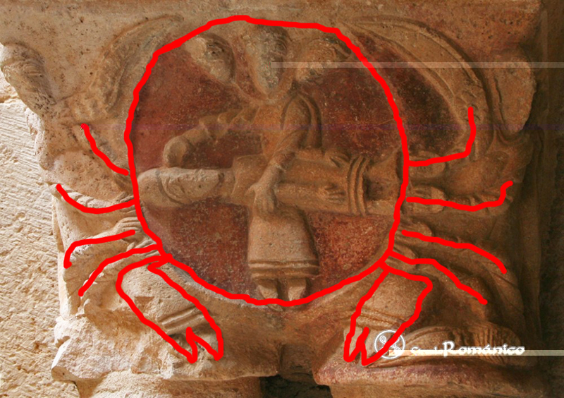 Si observamos las figuras inferiores de las esquinas, observaremos que las manos salen también de dos brazos y que tras cada dos brazos puede haber otro ángel con alas en forma de pinzas. Pero para ser sincero diré que las figuras inferiores hay que suponerlas pues no se ven bien; en un caso por deterioro del capitel y en otro caso por la misma composición. Aún así, me inclino más porque en la parte inferior se repiten los ángeles que por representar las pinzas de un cangrejo.